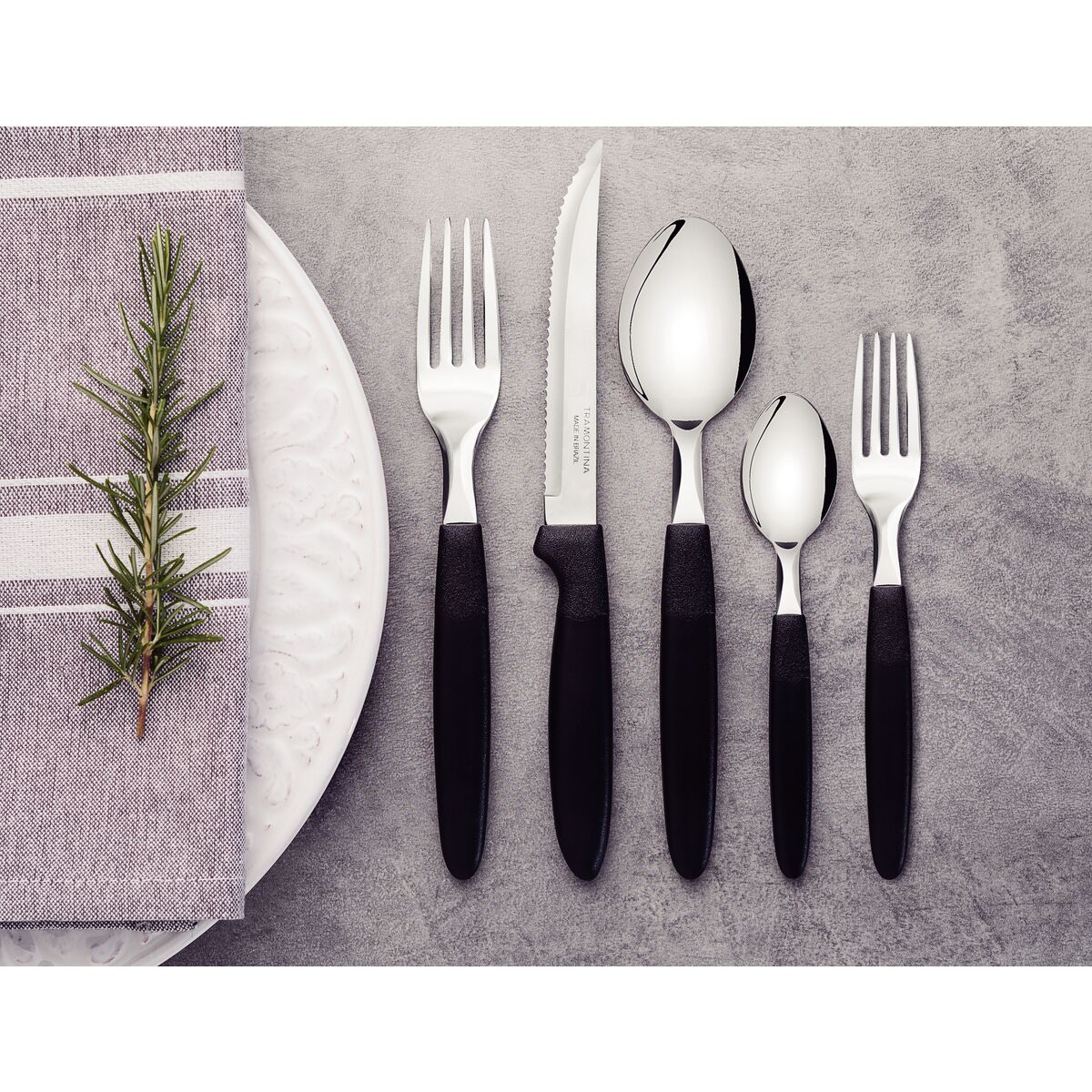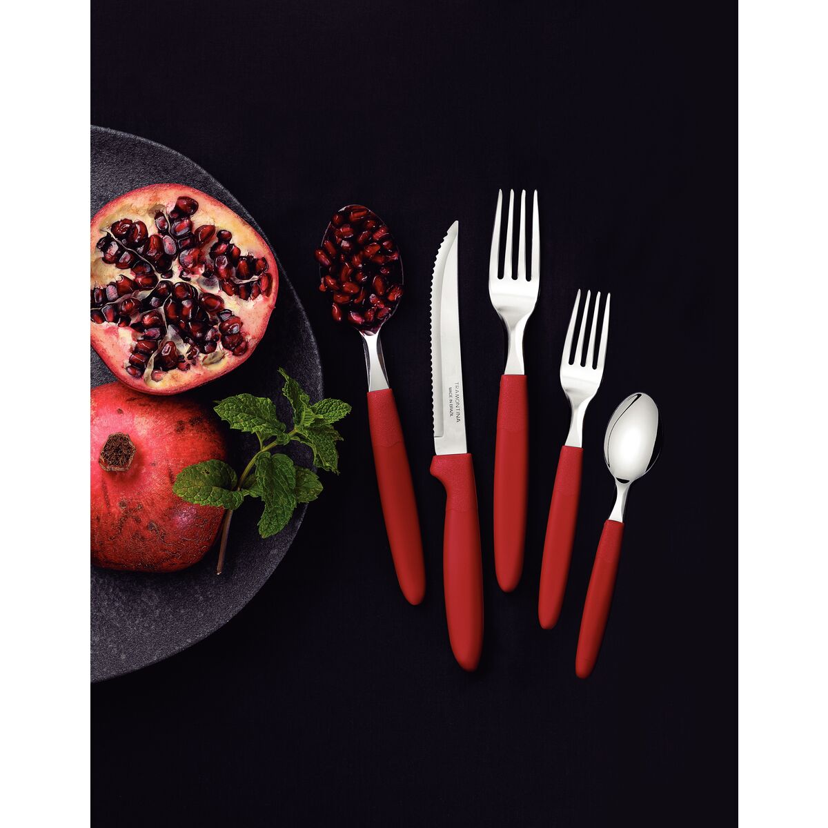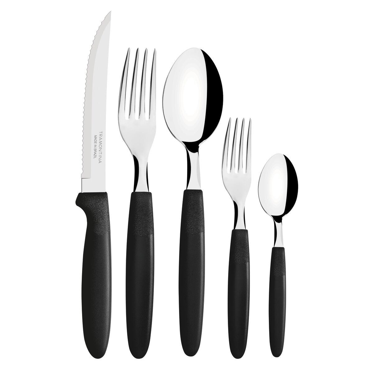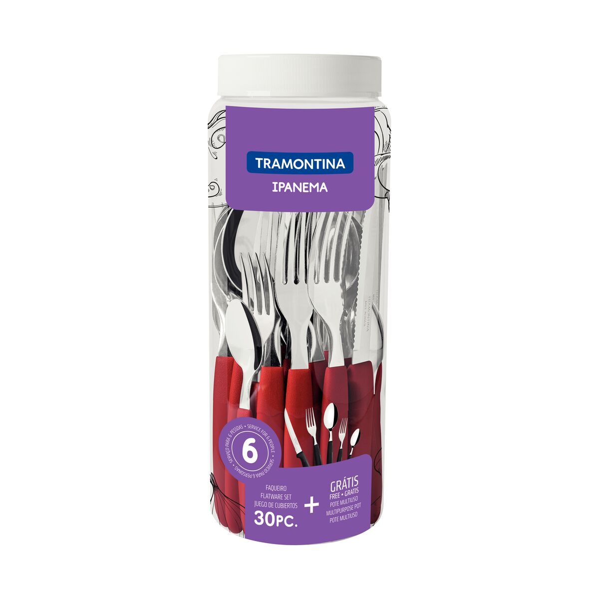 Juego de cubiertos Tramontina Ipanema con hojas de acero inoxidable y mangos de polipropileno negro y rojo y recipiente plástico, 30 piezas.
