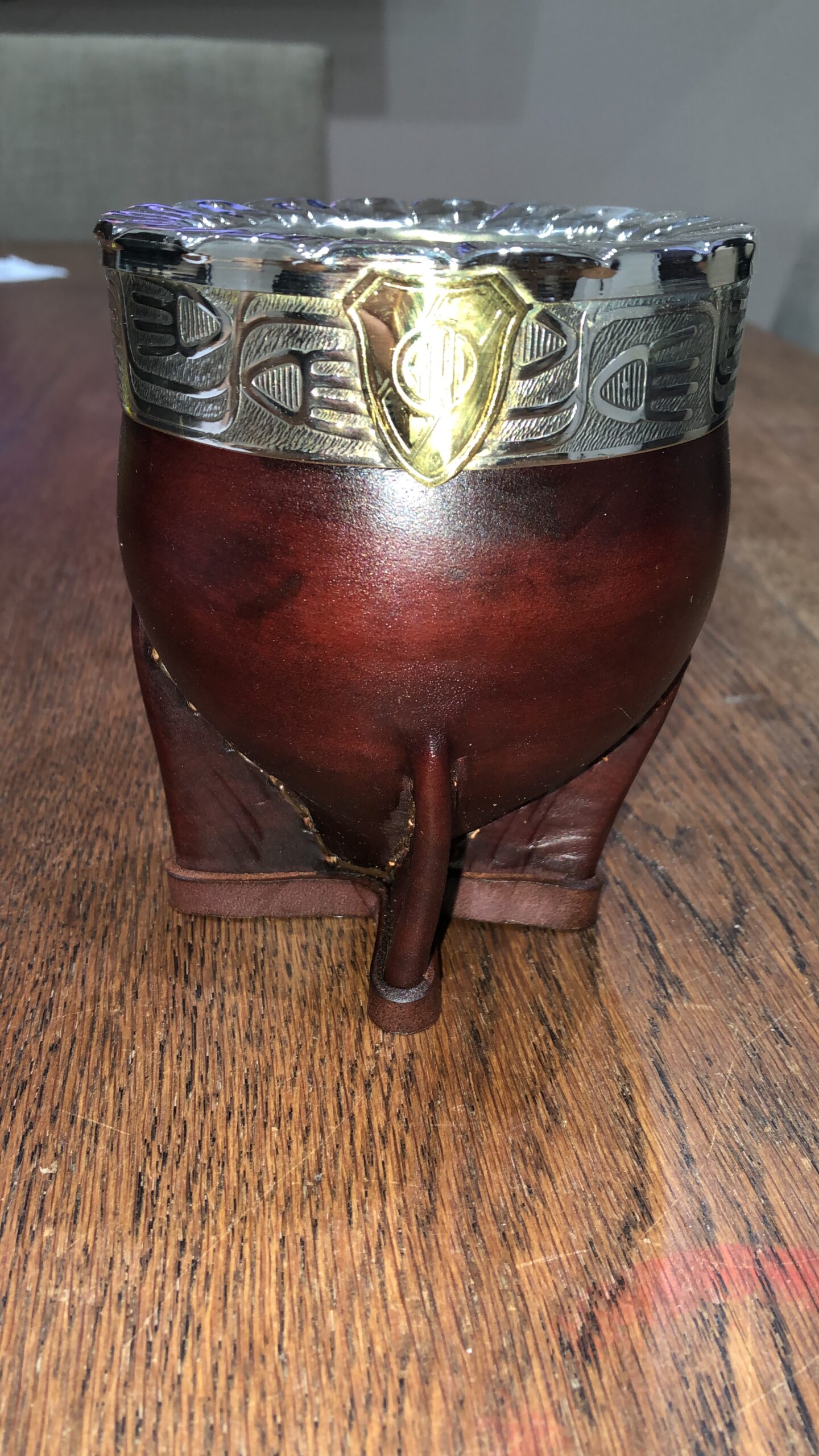 Mate Imperial de calabaza con virola de alpaca forrado en cuero.